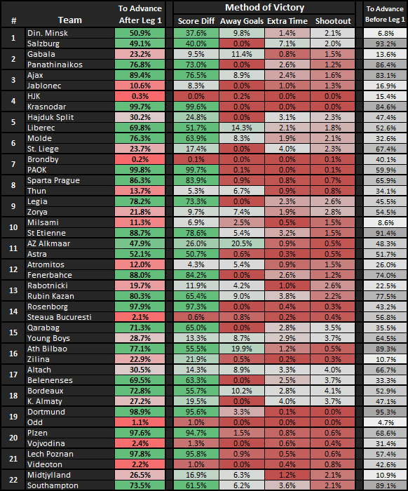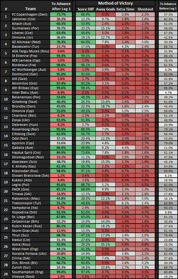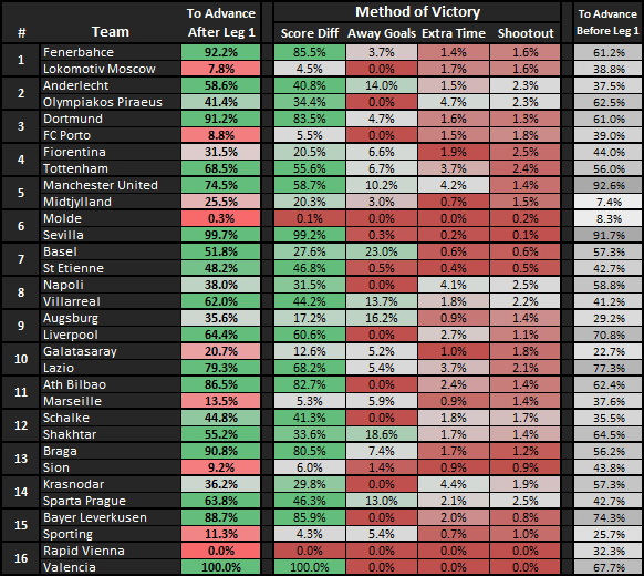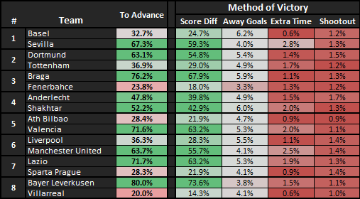 The Round of 16 knockout phase of the 2015-2016 UEFA Europa League tournament begins on March 10th and runs through March 17th. In this phase, each team plays a two leg series with the teams alternating as the home team. Below, we have listed our probabilities to advance to the Quarterfinals.