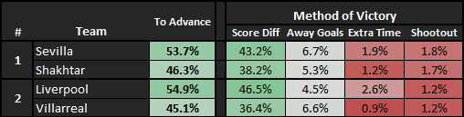 We are down to four teams with Shakhtar, Sevilla, Villarreal and Liverpool. Based on our simulation, both two-leg matches appear as if they can go either way.